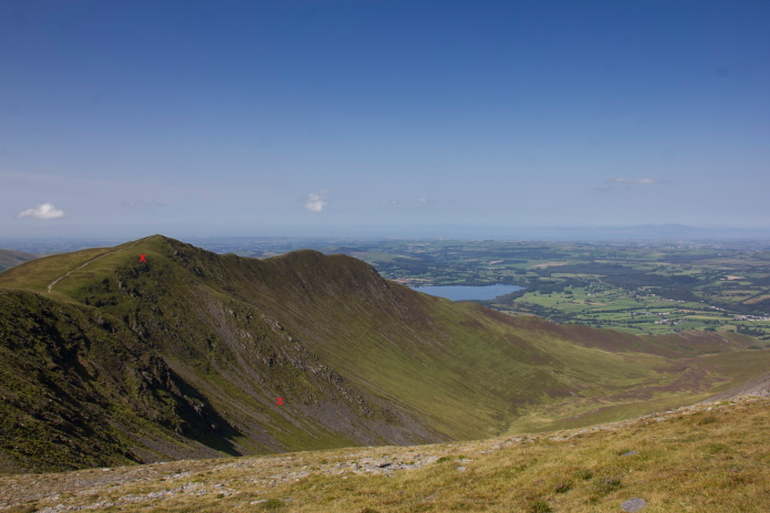 View across to Ullock Pike from the Tourist path to Skiddaw, the two red crosses mark each end of a wreckage trail from Wellington X3336, I visited that site a month or so later.*