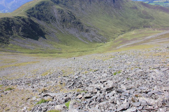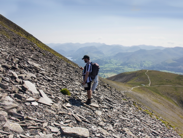 As we crossed over Carl Side we could see our search area for the B17 site, it was on very steep ground. The path from Millbeck joins the path that comes up from the Ravenstone Hotel via Ullock Pike and Longside here, but almost immediately splits in two again to tackle the last very steep section up onto the summit.