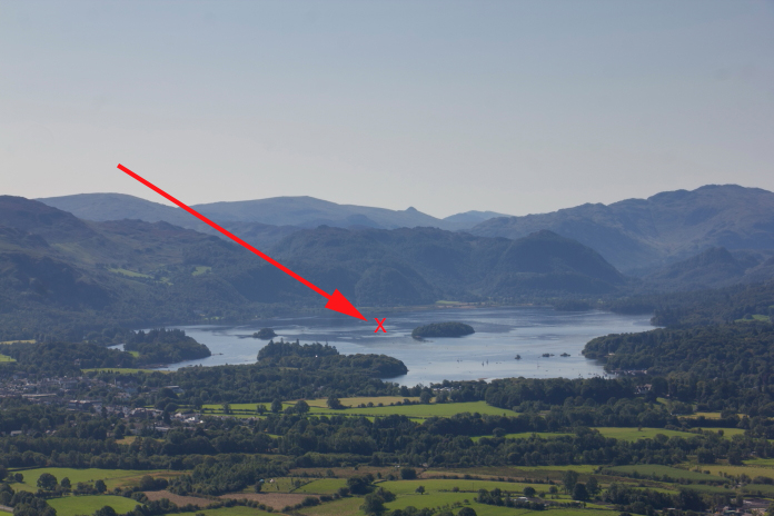 Above and below:-This is most probably the exact reverse photo of the photo below taken from a Little Motor boat on our previous trip to Keswick. I've put a red cross on each photo to show where the other one was taken from.