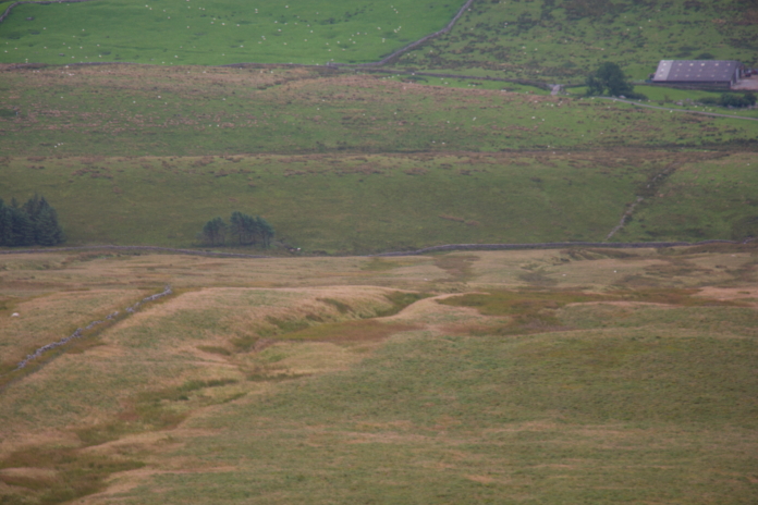 Where I ended up on the Pennine Journey path, which I mistook for the Pennine Way on the day; I was more or less directly above the first crashsite I wanted to visit. Instead of walking 1km south along the path to reach the path down the other side of the hill, then 1km back along the base of the slope to reach the crashsite I went straight over and down. The incline this way was very steep so I sat down and slid down on my backside; luckily there was enough grassy areas to avoid having to slide over any rocks or boulders.