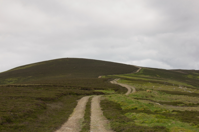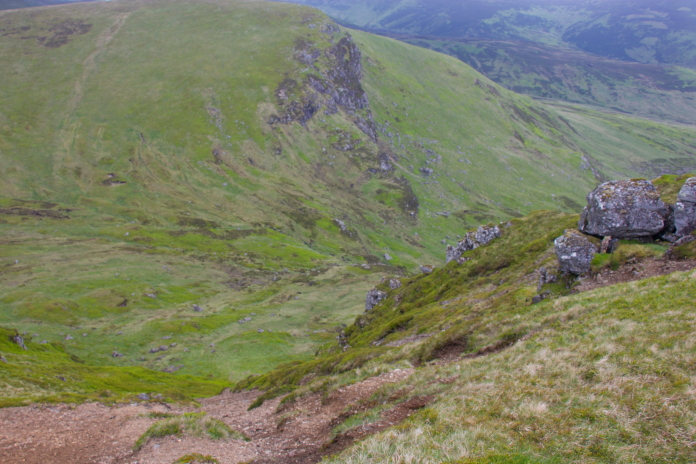 View of the track over to Bawhelps, the pointy summit in the distance is Mayer which at 928.6m