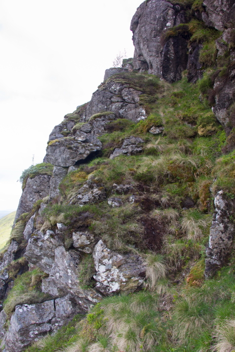 Above and below:-Off the ledge and onto a broad grassy gully that provided a safe and easy, but steep, exit from the Bawhelps cliffs.